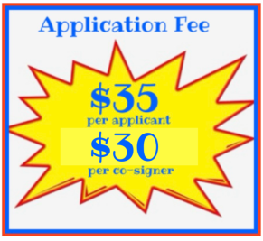 There is a $30 non-refundable co-signer application processing fee [in the event a co-signer is allowed] in order to process a credit check on a co-signer. We accept Cashier's Check, Money Order, or Cash for source of payment for Application fees, we do NOT accept cards and don't have change.