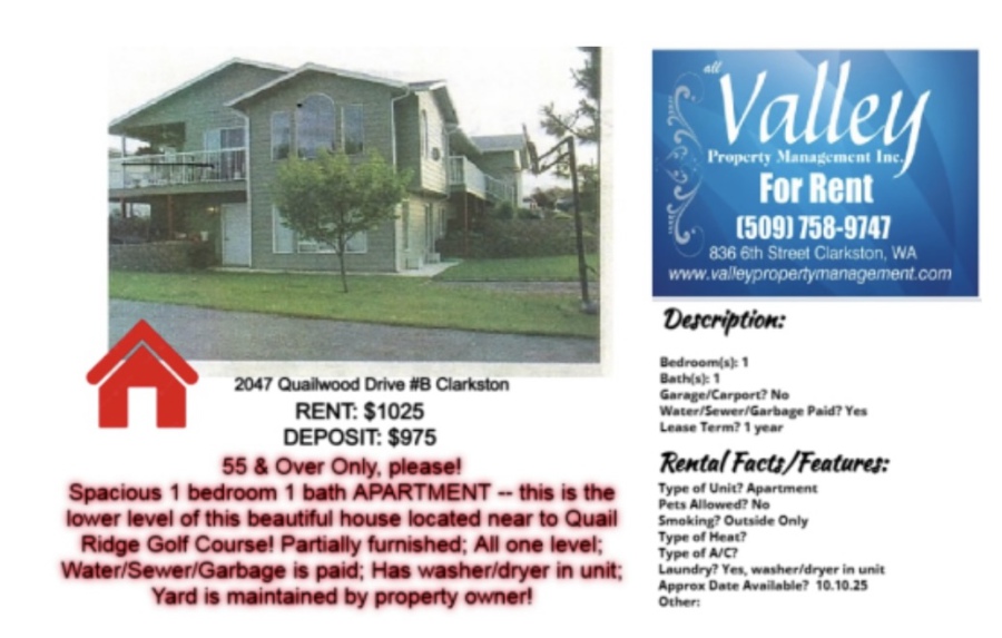 BEAUTIFUL decor & comfortably furnished 1 bedroom 1 bath apartment located near Quailridge Golf Course -- for those 55 or older only, please!
