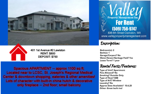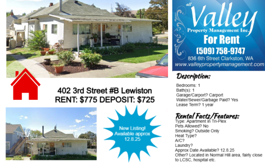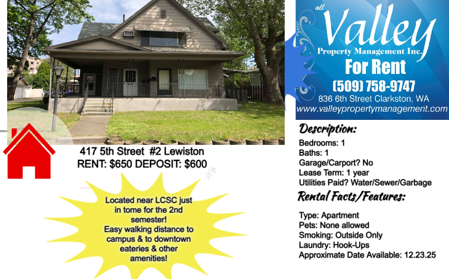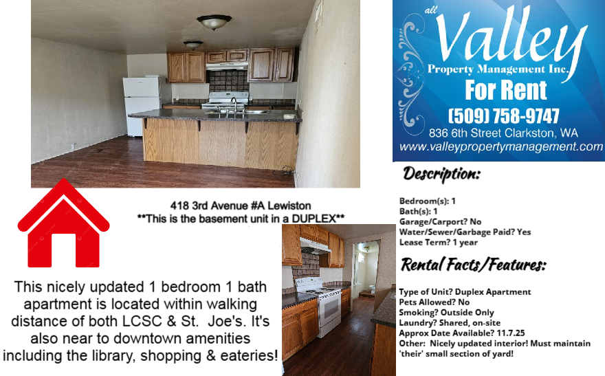 1 bedroom 1 bath APARTMENT located near to the hospital & LCSC; Close by to downtown amenities: shopping, eateries, the library, bike path etc. Water/sewer/garbage is paid by property owners -- HEAT is also paid -- tenants are responsible for Avista for their electricity service; No smoking of any kind on premises/No pets; Available: NOW; 1 year lease term is required!